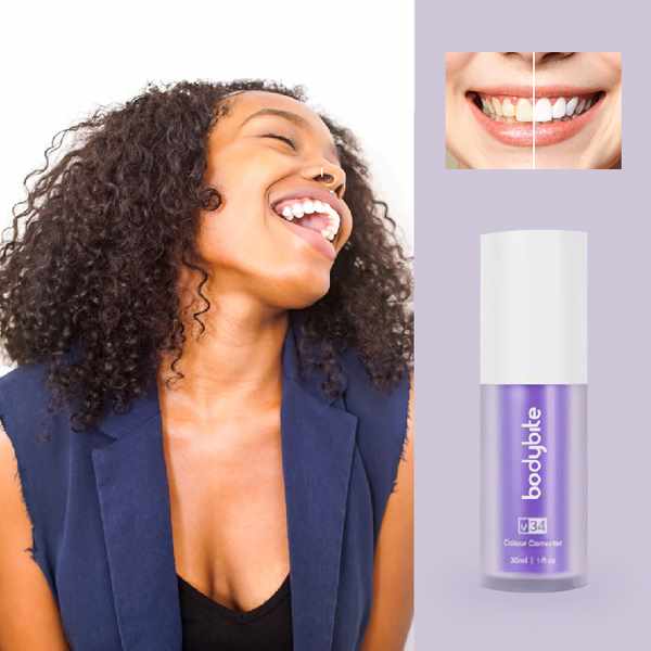 V34 využívá technologii korekce barev k viditelnému zvýšení jasu vašeho úsměvu. Protože fialová je doplňkovou barvou ke žluté, složení pomáhá vyvážit nežádoucí žluté tóny pro rovnoměrnější a zářivější vzhled. Výsledkem je okamžitě svěžejší úsměv – bez drsných ošetření nebo složitých kroků.